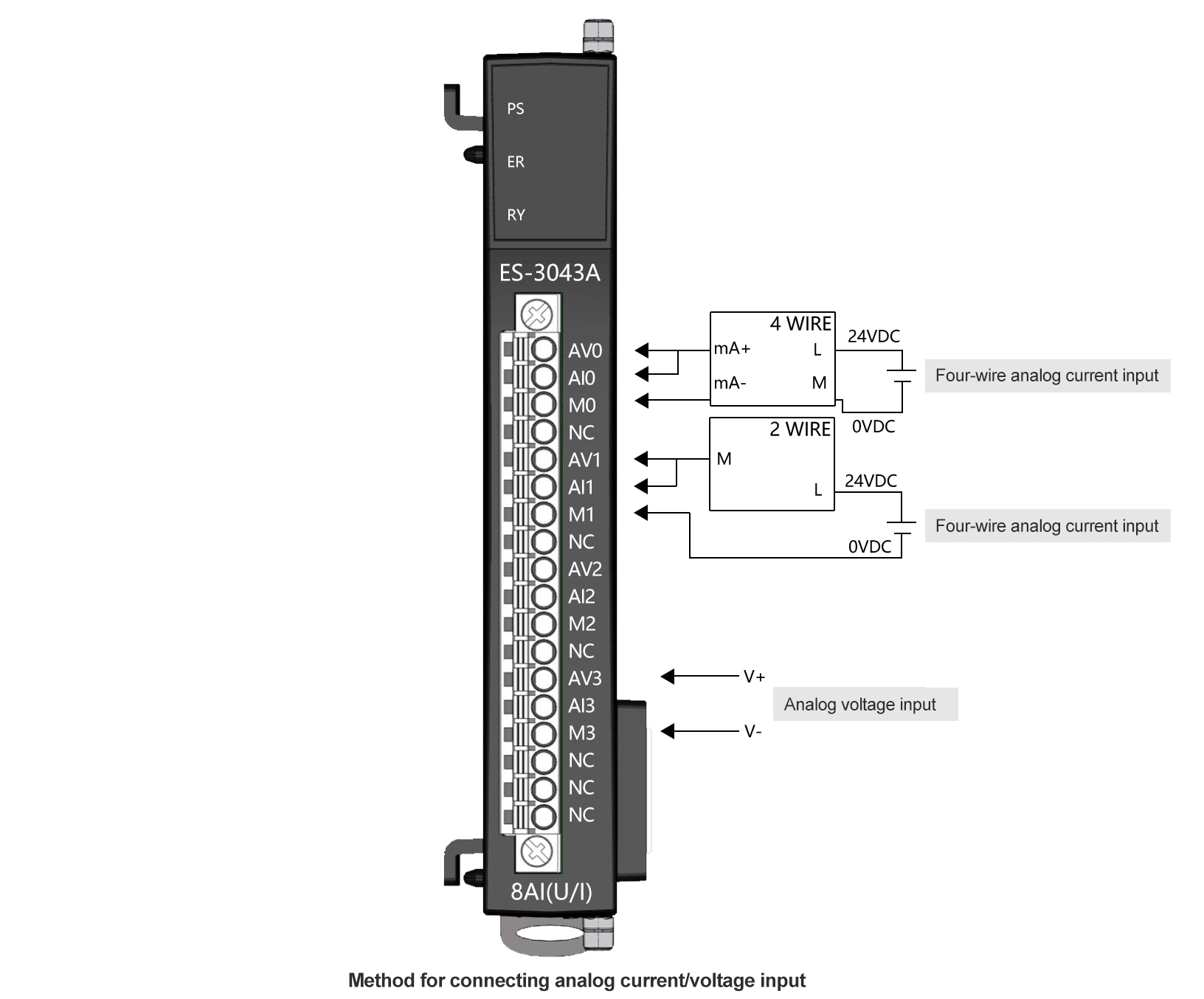 Slice Type Multi-Functional Distributed I/O, analog input 4AI, resolution 16 bits, sampling error ±0.1% (full scale), 0~20mA, 4~20mA (open circuit detection), 0~10V, ±10V, 24VDC