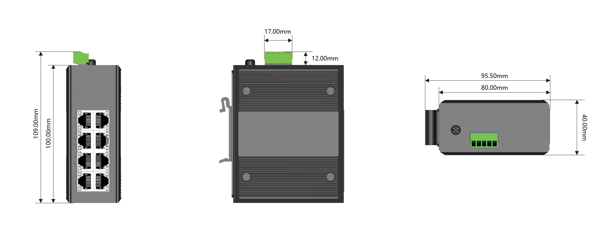 Unmanaged industrial switch, mini type, 8 Ethernet ports, 100 Mbps, 12V - 52V DC, IP50, metal casing, DIN35 rail mounting