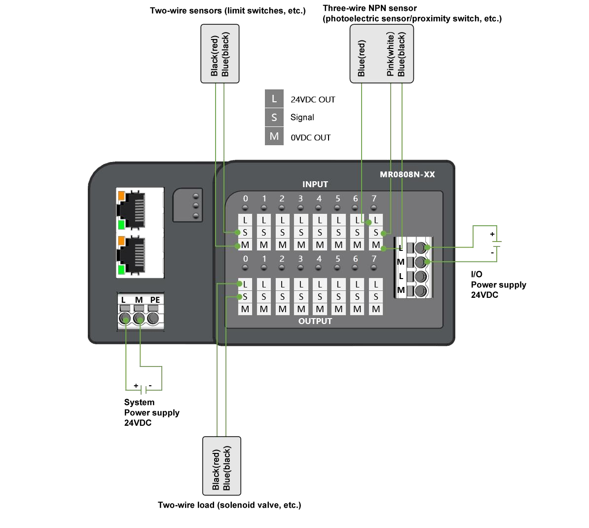 Power interface: Module power supply: 3P European spring terminal; Load power supply: 4P European spring terminal