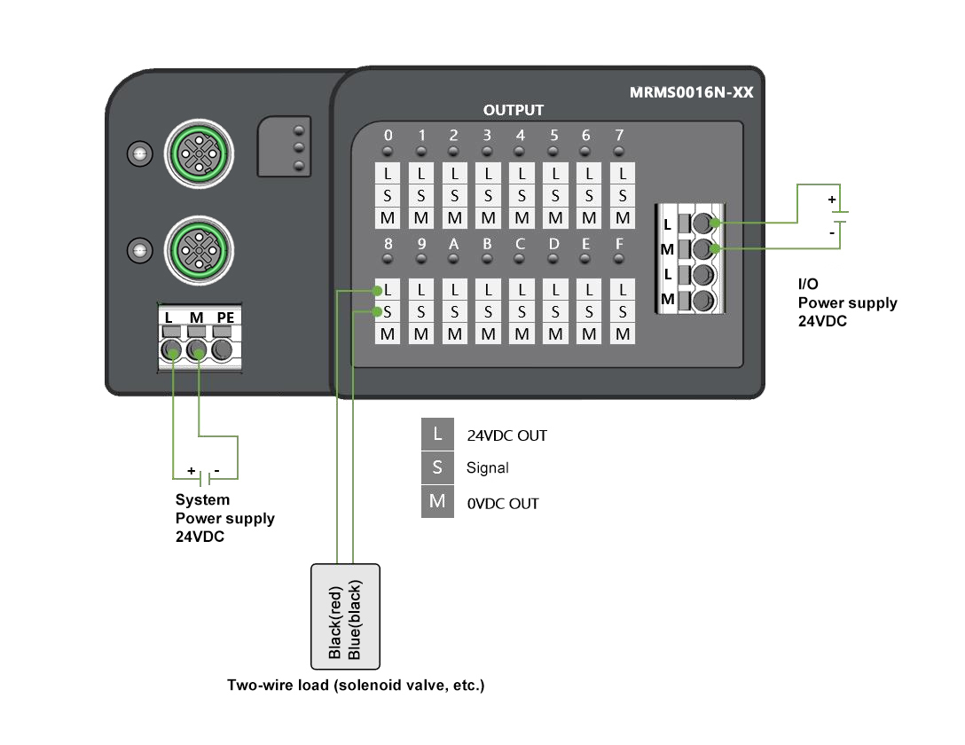 Panel Type Distributed I/O Module, EtherCAT communication, 2xM12, can be casciced; Digital quantity 16 output NPN, 24VDC, 0.5A, European spring terminal; Guide rail installation & drilling installation (Please note when placing an order)
