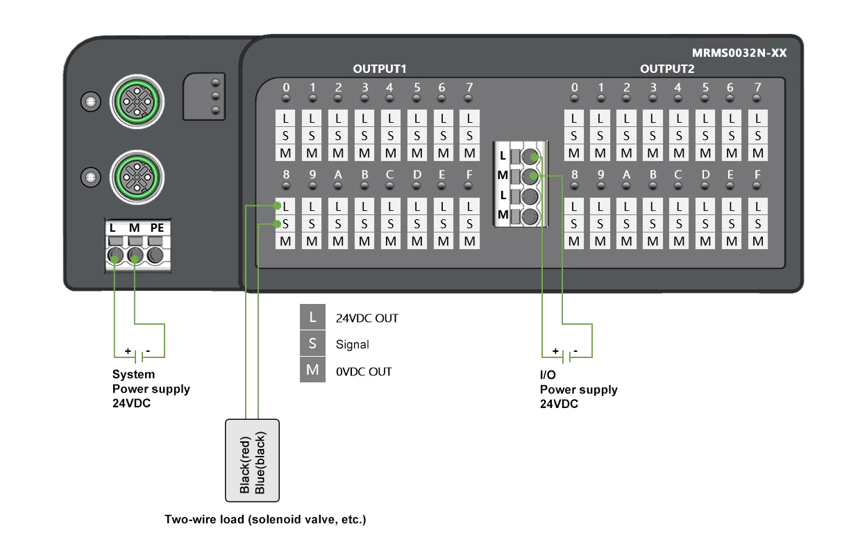 Panel Type Distributed I/O Module, CC-Link IE FieldBasic communication, 2xM12, can be casciced; Digital quantity 32 output NPN, 24VDC, 0.5A, European spring terminal; Guide rail installation & drilling installation (Please note when placing an order)