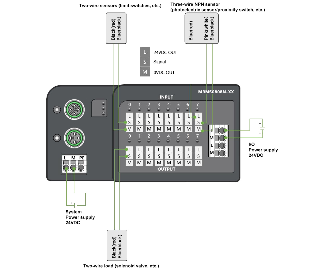Panel Type Distributed I/O Module, CC-Link IE FieldBasic communication, 2xM12, can be casciced; Digital 8-in 8-out NPN, 24VDC, 0.5A, European spring terminal; Guide rail installation & drilling installation (Please note when placing an order)