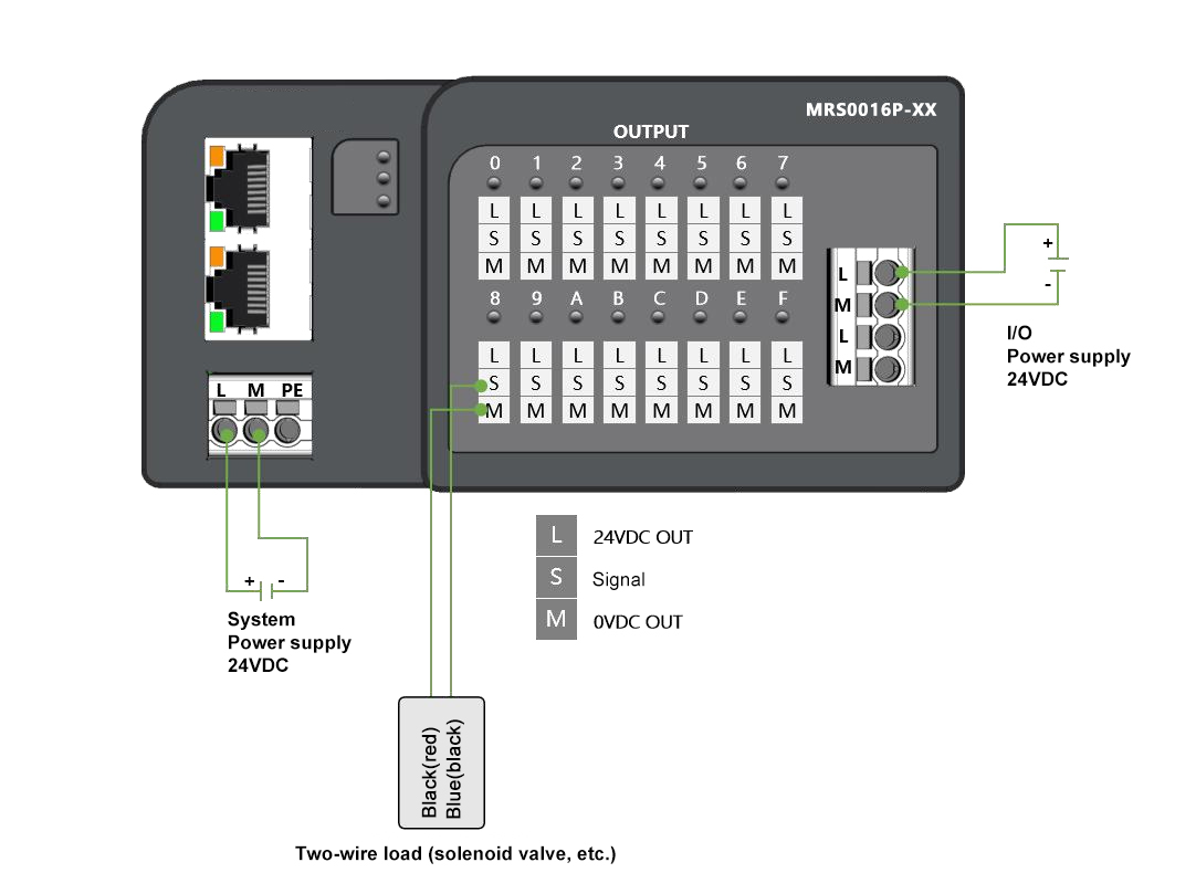 Panel Type Distributed I/O Module, CC-Link IE FieldBasic communication, 2xRJ45, can be casciced; Digital quantity 16 output PNP, 24VDC, 0.5A, European spring terminal; Guide rail installation & drilling installation (Please note when placing an order)